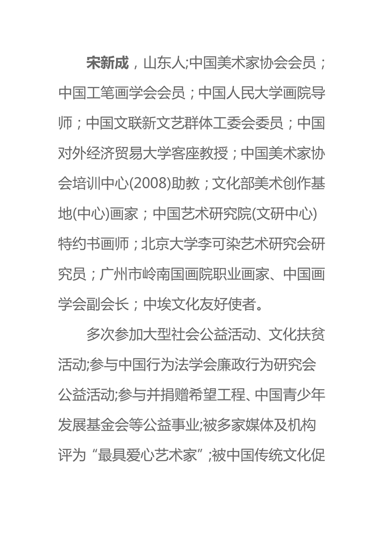 宋新成,山东人;中国美术家协会会员;中国工笔画学会会员;中国人民大学画院导师;中国文联新文艺群体工委会委员;中国对外经济贸易大学客座教授;中国美术家协会培训中心(2008)助教;文化部美术创作基地(中心)画家;中国艺术研究院(文研中心)特约书画师;北京大学李可染艺术研究会研究员;广州市岭南国画院职业画家;中国画学会副会长;中埃文化友好使者。