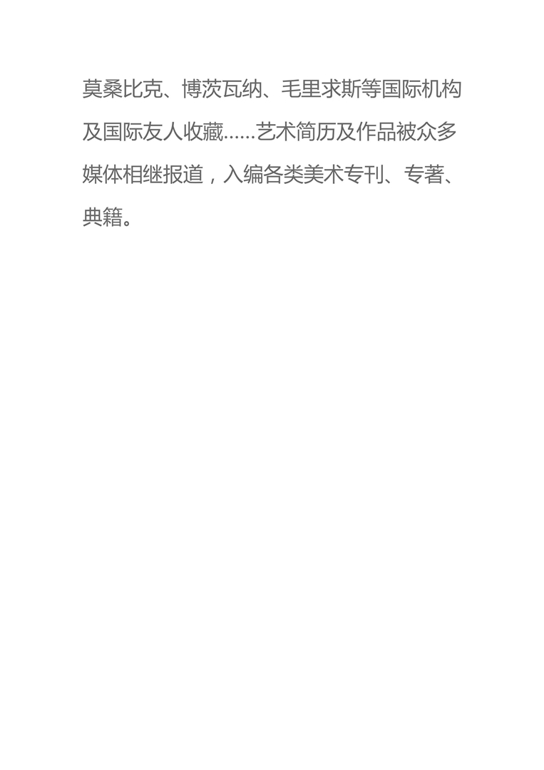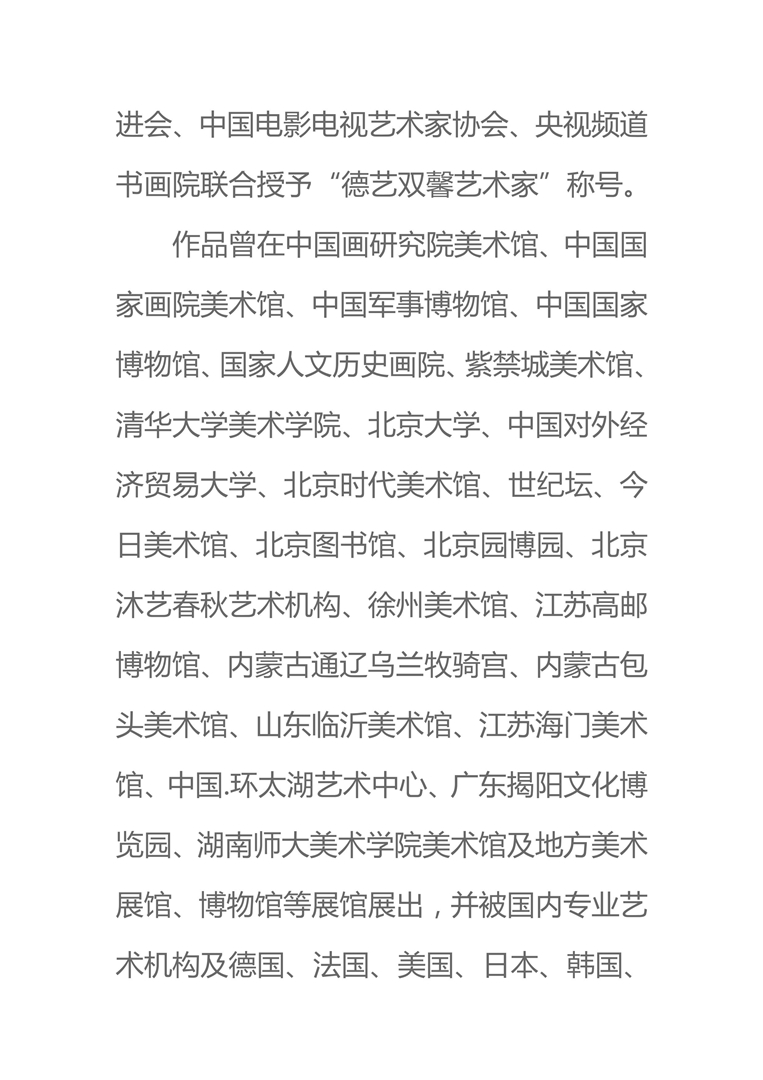 作品曾在中国画研究院美术馆、中国国家画院美术馆、中国军事博物馆、中国国家博物馆、国家人文历史画院、紫禁城美术馆、清华大学美术学院、北京大学、中国对外经济贸易大学、北京时代美术馆、世纪坛、今日美术馆、北京图书馆、北京园博园、北京沐艺春秋艺术机构、徐州美术馆、江苏高邮博物馆、内蒙古通辽乌兰牧骑宫、内蒙古包头美术馆、山东临沂美术馆、江苏海门美术馆、中国.环太湖艺术中心、广东揭阳文化博览园、湖南师大美术学院美术馆及地方美术展馆、博物馆等展馆展出,并被国内专业艺术机构及德国、法国、美国、日本、韩国、莫桑比克、博茨瓦纳、毛里求斯等国际机构及国际友人收藏……艺术简历及作品被众多媒体相继报道,入编各类美术专刊、专著、典籍。
